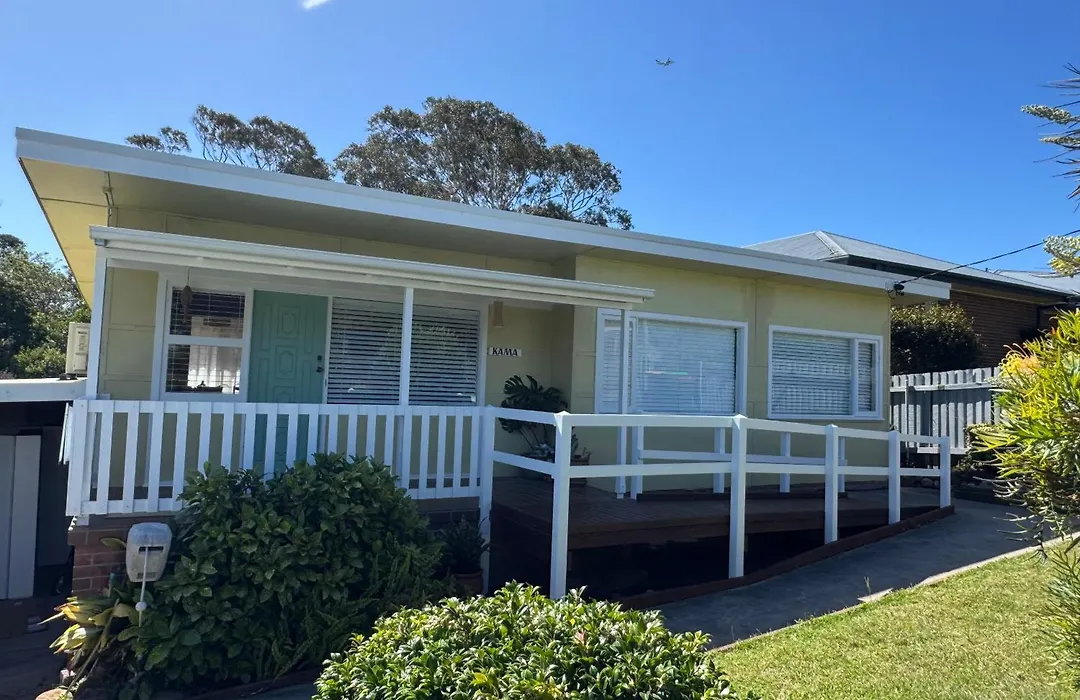 Kama Beach House Merimbula villa is located a 10-minute walk from Spencer Park and invites guests to enjoy a terrace.